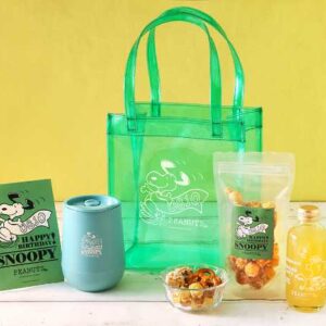 外装のパステルブルーとネイビーの落ち着いた組み合わせに、友情と希望の象徴“記念の木”の下で集うPEANUTS™キャラクターがプリント。