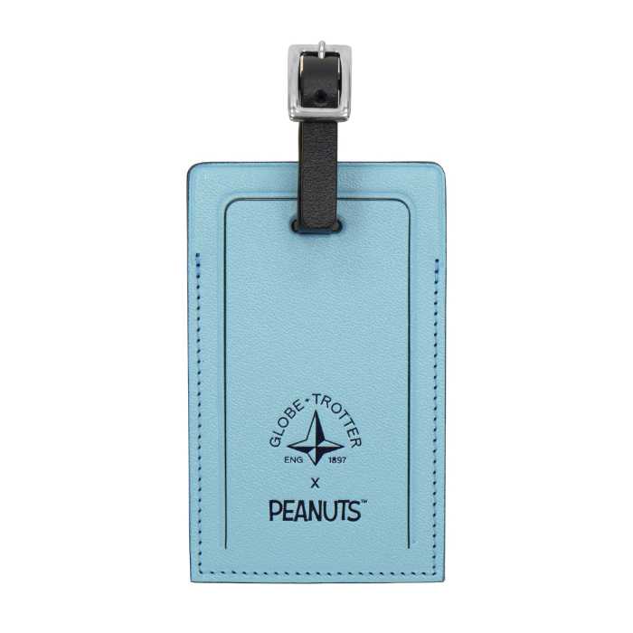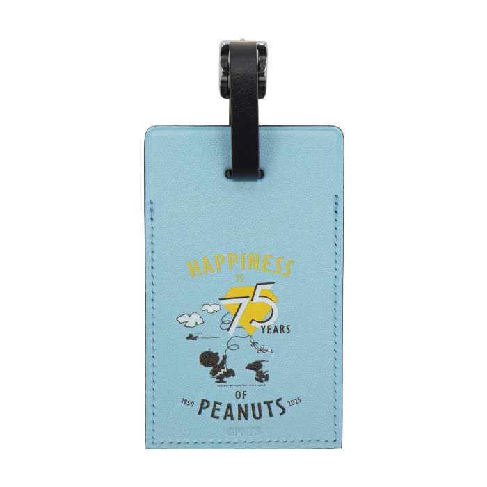 軽やかなパステルブルー×ネイビーコーナーに、スヌーピーたちの愛らしいプリント。シリアルナンバーレザーパッチ付き。