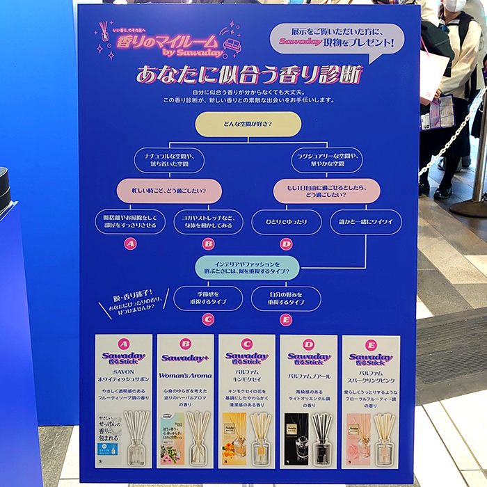 「自分に合う香りがわからない……」そんな悩みを持つ人に向けた香り診断コーナーもありました。