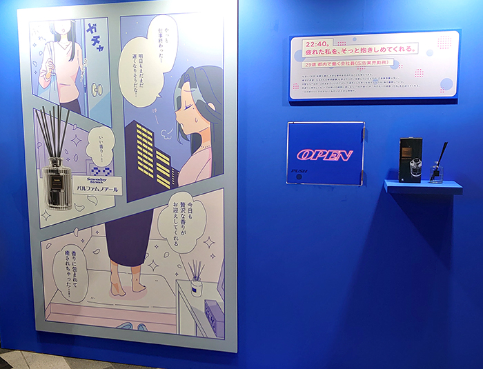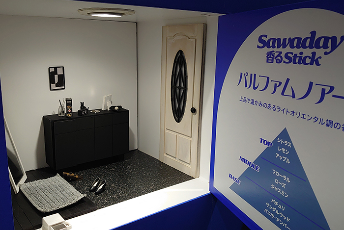 会場に入ってまず心をつかまれたのは、「Sawaday」の香りからインスパイアされた漫画風グラフィックとミニチュアのお部屋。