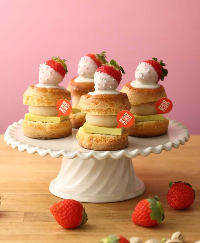 バターミルクスコーンに自家製のピスタチオバターと白あんを挟み、ホワイトチョコをまぶした苺をトッピング。