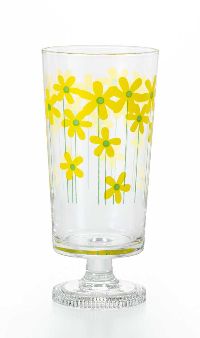 アデリアレトロ 脚付きグラス「純潔」は昭和47年発売の復刻デザイン。明るい黄色の花々が散りばめられ、下から上にかけて密度が増すグラデーションが美しい印象です。