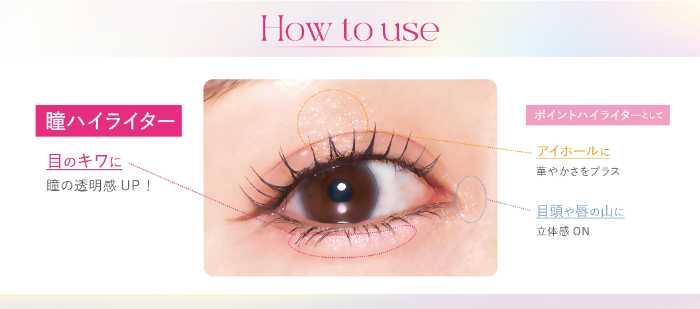 色味が主張しすぎないため、上唇の山や鼻筋などにポイントハイライターとしても活用可能。目元全体の印象を明るく透明感のある仕上がりに整え、日常メイクに華やかさをプラスします。