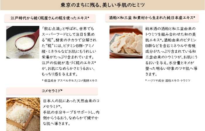 今回登場する東京限定アイテムは、江戸時代から続く糀屋の糀を使用したオリジナルエキス*を配合しているのが特徴です。