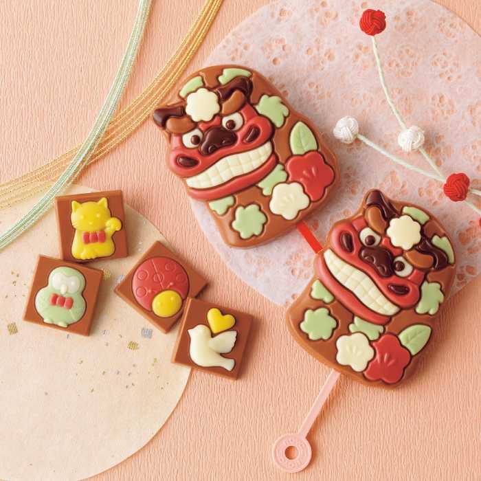 「ロイズ チョコレートワールド 迎春プチセット」は、獅子舞の形をした限定ポップチョコと、フクロウ・てんとうむし・ハト・招き猫をモチーフにしたラッキーチョコがセットに。
