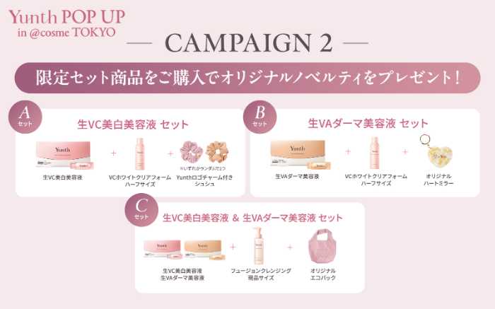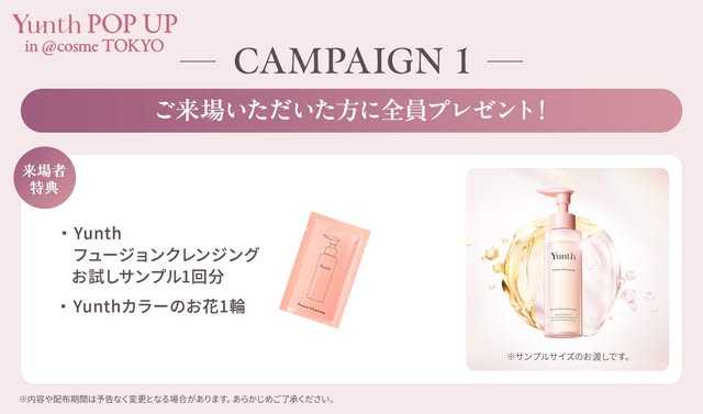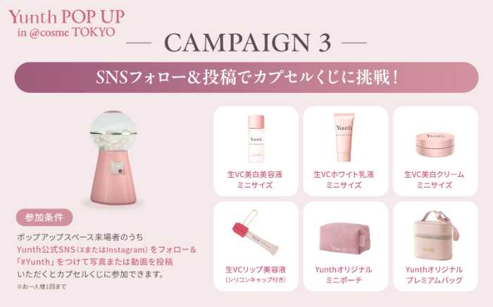 スキンケアブランドYunth(ユンス)は、2025年12月10日(水)〜12月16日(火)の期間限定で@cosmeTOKYOにてポップアップストアを開催します。今回のイベントでは、ブランドアンバサダーに就任したBTS・Vさんのビジュアルがお出迎えし、Yunthの世界観を五感で楽しめる特別な空間に♡来場者限定の特典や、ここでしか購入できない限定セットの販売など、多彩な企画を用意。事前予約制(平日19:00〜21:00は予約不要)で入場できる特別な7日間です。