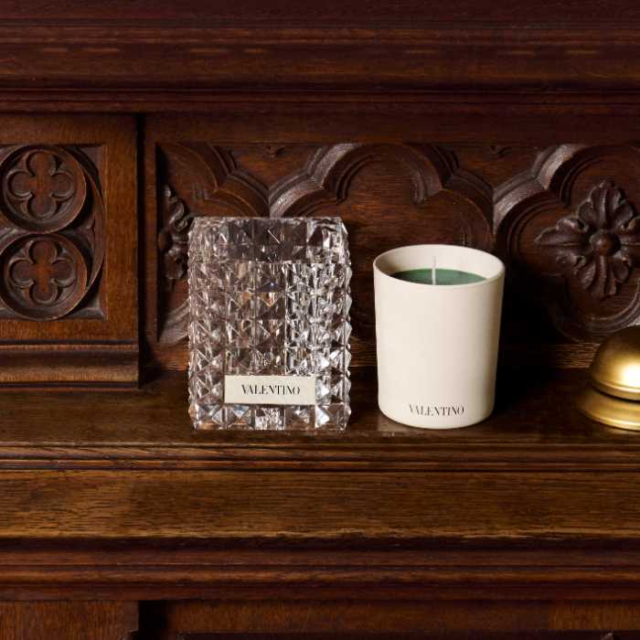 ガラス製キャンドルホルダー「ヴァレンティノ レ ブジョワール」は、ローマ宮殿のブニャート装飾とアイコニックなスタッズに着想を得たアートオブジェ♡