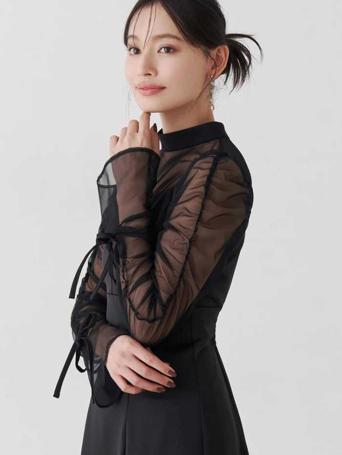 次にご紹介するのは、サテンシアーギャザースリーブワンピース。繊細なシアートップスと光沢感のあるサテンキャミワンピースをレイヤードしたデザインが特徴。