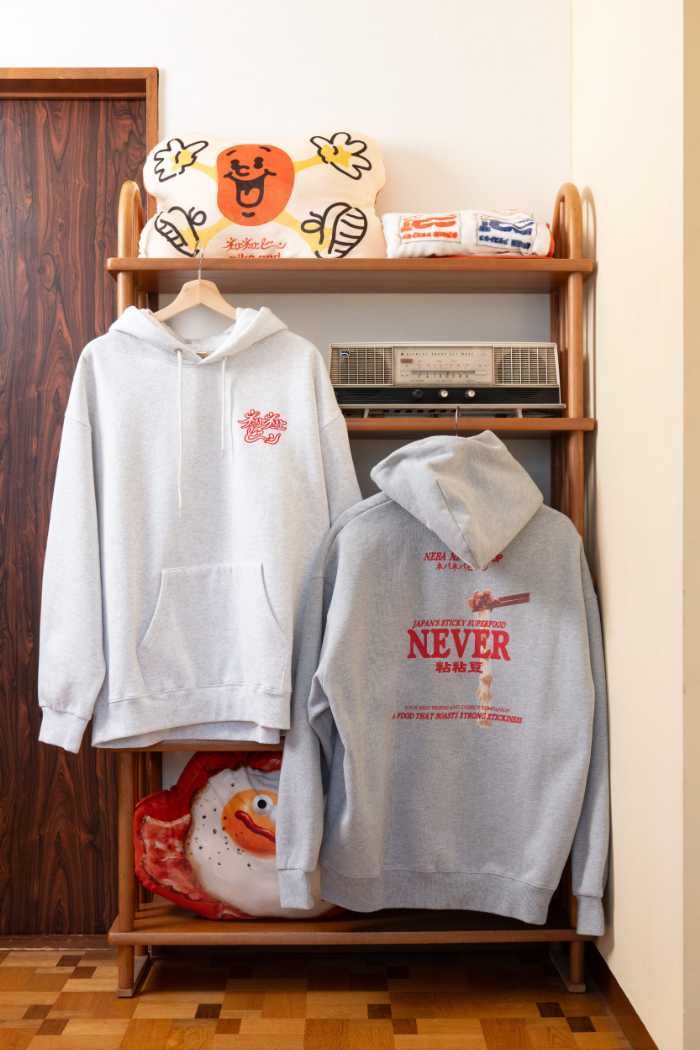 **「ネバネバビーンフーディー」(8,000円・ライトグレー/M・L)は、納豆パッケージをコラージュした挑戦的なビジュアルで、背中まで楽しい一着に。