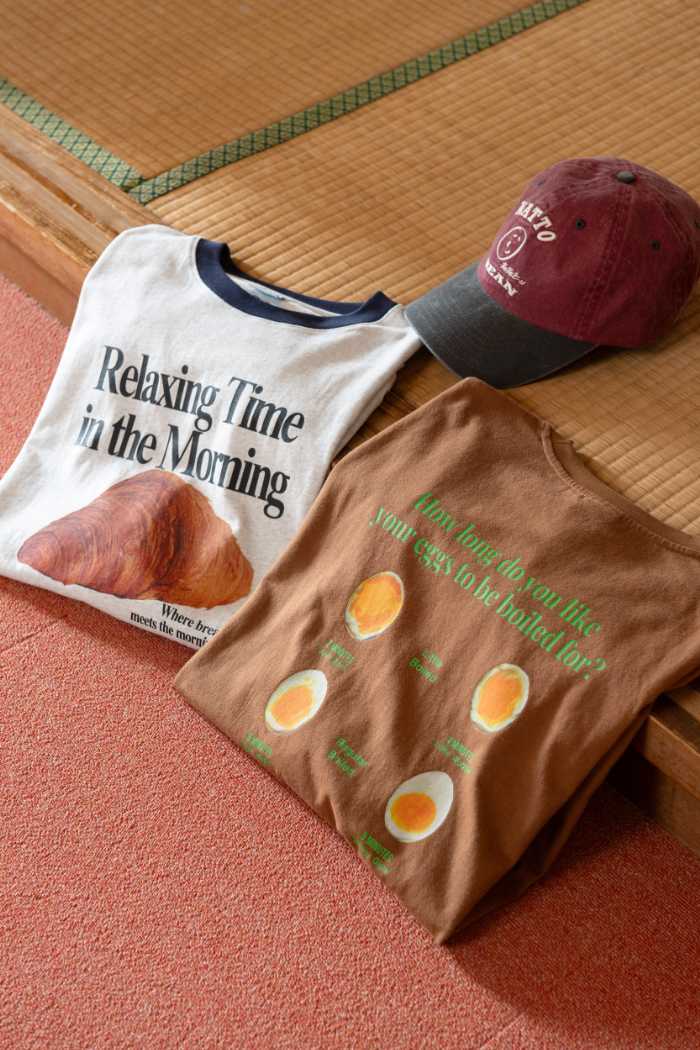 さらに、「ASAGOHANロングスリーブT-SH」(6,001円・ブラウン/M・L)**は、“ゆで卵の茹で加減”をテーマにしたユニークなグラフィックが魅力。