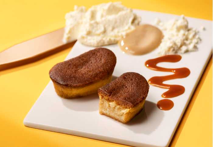 上層には焼きバナナのような香ばしいキャラメル生地をのせ、しっとり&ほろっとした食感を実現。二層の味わいが口の中でとろけ、バナナとチーズの風味が絶妙に広がります。