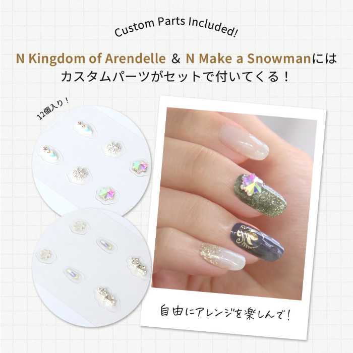 N Kingdom of ArendelleとN Make a Snowmanには、6種×2枚(計12枚)のカスタムパーツシール付き♡硬化済みのネイルシールに貼るだけで、自分好みの配置にアレンジ可能。