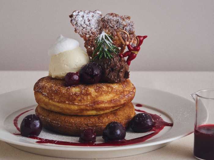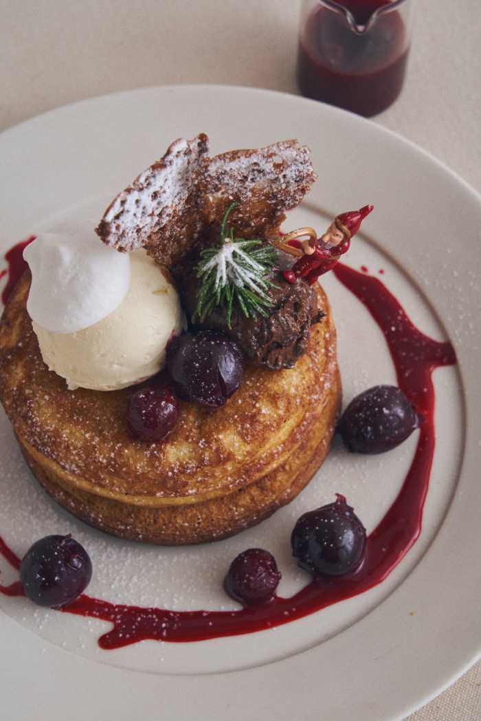 ショコラの深いコクとチェリーの鮮烈な酸味が調和したフォレノワールパンケーキは、まさに“大人のクリスマス”を表現した一皿。