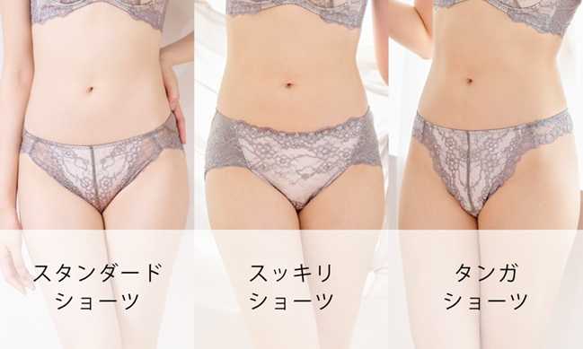 スタンダードショーツはお尻をしっかり包み込んでくれる設計、スッキリショーツはヒップラインをキレイに見せるカット、タンガは総レースでヒップの丸みを強調します。