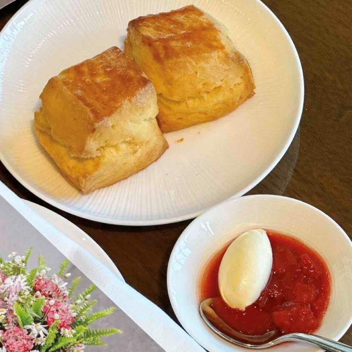 コンラッド大阪を象徴する胡蝶蘭の香りを纏わせて焼き上げたクラシックなスコーン。 サクッとした食感の後、ふわっと華やかな余韻が広がります。ストロベリージャムとクロテッドクリームを添えて。