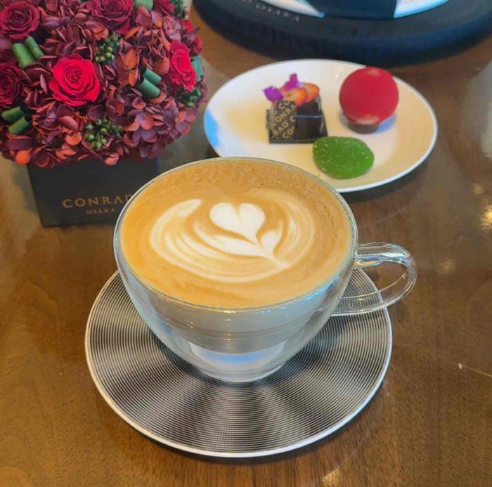 ニコライ バーグマンの華やかなアレンジメントを眺めながら、ハートのラテアートが描かれたカプチーノをいただきました。きめ細やかな泡の口当たりと、贅沢な空間が日常を忘れさせてくれます。