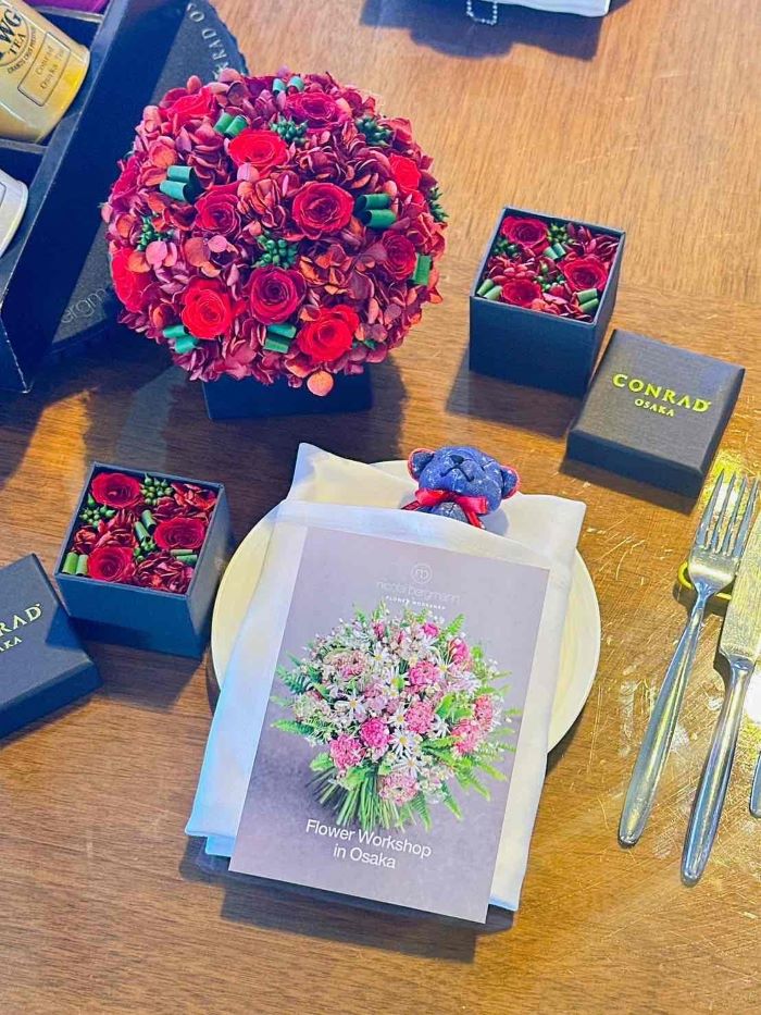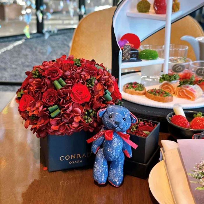 今回は数量限定のコンラッド大阪ロゴ入り プリザーブドフラワーボックスとホリデーベア付きプラン。贅沢なテーブルコーディネートに心ときめきます。