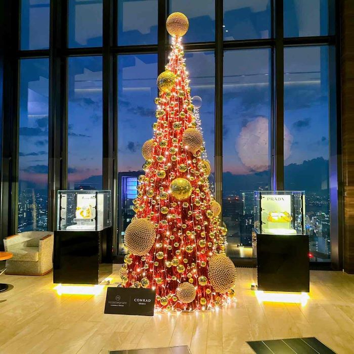 ニコライ バーグマンが手がけた、特別なクリスマスツリー。神秘的なブルーモーメントの空を背に、レッドとゴールドの輝きが都会の夕景と重なり合います。