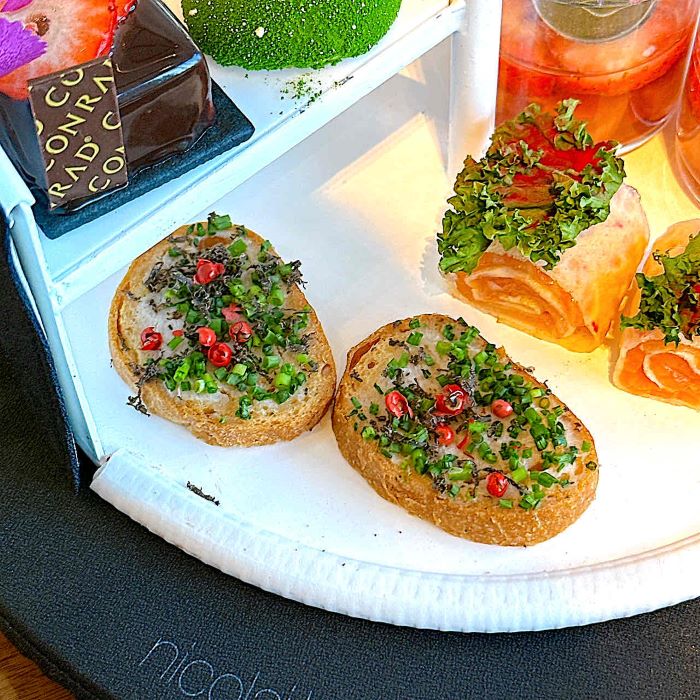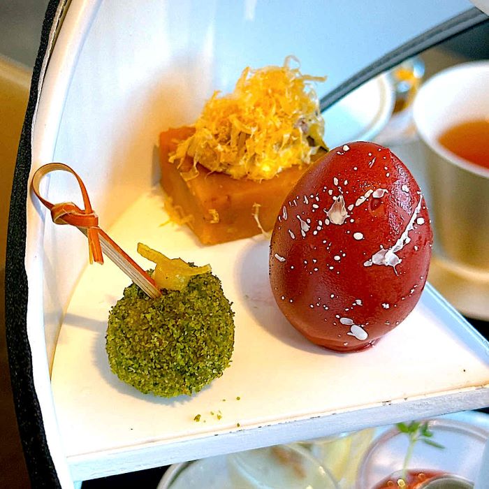 コンラッド大阪の象徴的な螺旋階段を模したスタンドには、ニコライ バーグマンの感性にインスピレーションを得た、宝石のようなスイーツとセイボリーが並びます。