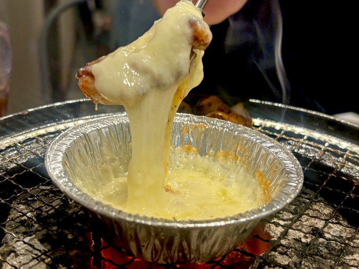 旨辛ダレをまとったチキンを焼いて、七輪で仕上げるとろとろチーズ。ジューシーなチキンに絡ませると、まろやかでコク深い味わいに。冬にぴったりの一品です。