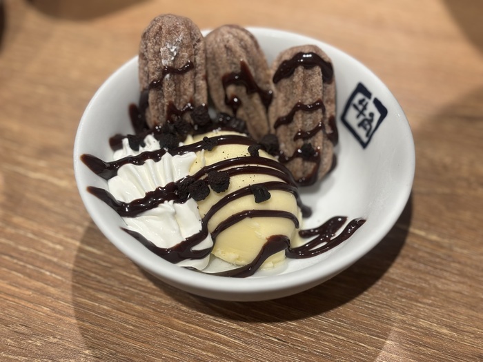 七輪で炙ったアツアツのチョコチュロスに、クリーミーで甘いひんやりバニラアイスを合わせています。サク&トロ食感で、チョコソース、クッキーのザクザク感がアクセントになった、本格派韓国スイーツです。
