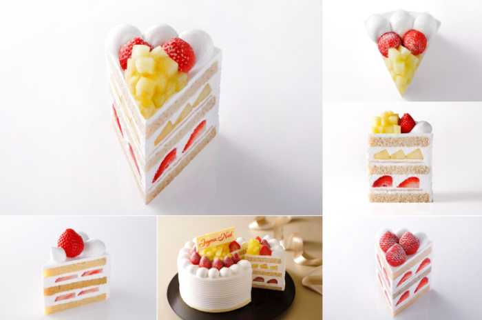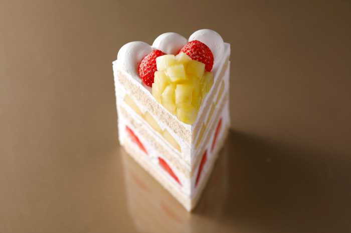 トップにはエルダーフラワー葛を纏わせ、あまおうの層・マスクメロンの層・トップフルーツの三層が楽しめる、贅沢で華やかな冬限定ケーキです。