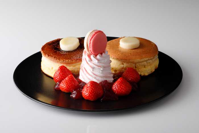 『ホテルニューオータニ特製あまおうパンケーキ』3,630円(サービス料別)は、リコッタ・クリームチーズ・マスカルポーネをブレンドした生地にホワイトシリアルや乳酸菌を加え、豆乳ガナッシュやキャラメリゼで仕上げたふんわり軽やかな一皿です。