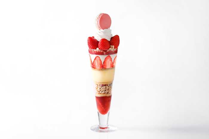 『あまおうパフェ』3,630円(サービス料別・東京・大阪)は、フレッシュあまおうやジュレ、マカロン、マスカルポーネクリーム、グラノラなど13層の多彩な食感を楽しめる贅沢パフェ。