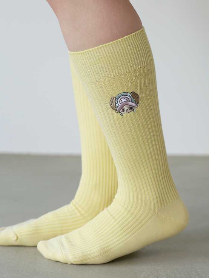 <ONE PIECE “CHOPPER’s” 刺繍2本ラインソックス>は、ローゲージの2本ラインにチョッパー刺繍が施され、カジュアルコーデにさりげなく可愛さをプラス。