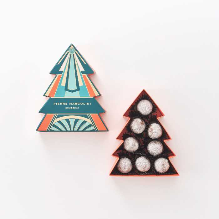 ホリデーショコラの中でも注目は、芳醇なシャンパンの香りを閉じ込めたトリュフをツリー型のボックスに詰めた「プティサパンドゥノエル(3,564円)」。