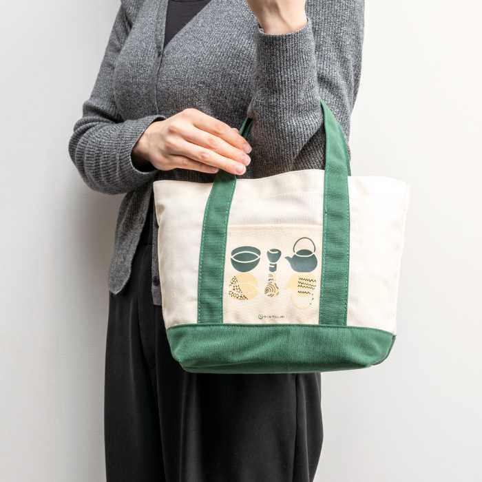 特典には、茶器モチーフをあしらった「オリジナルランチトート」を添付。生成りキャンバス地に深緑アクセントが映え、デイリー使いにも便利です。