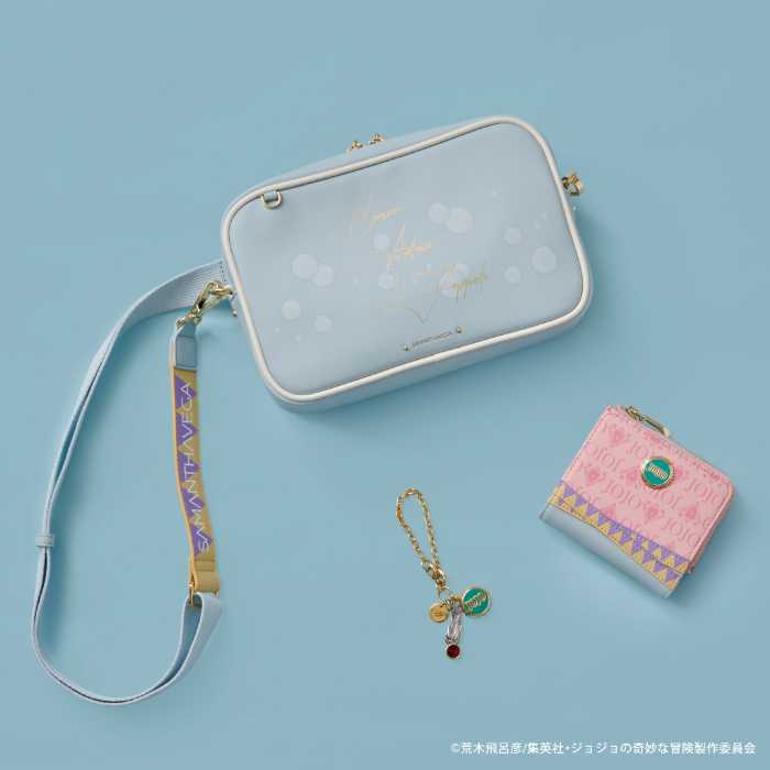 バッグと財布にはジョースター家の壁紙模様を総柄でデザインし、それぞれのベルトをイメージしたフロントデザインがアクセントに。