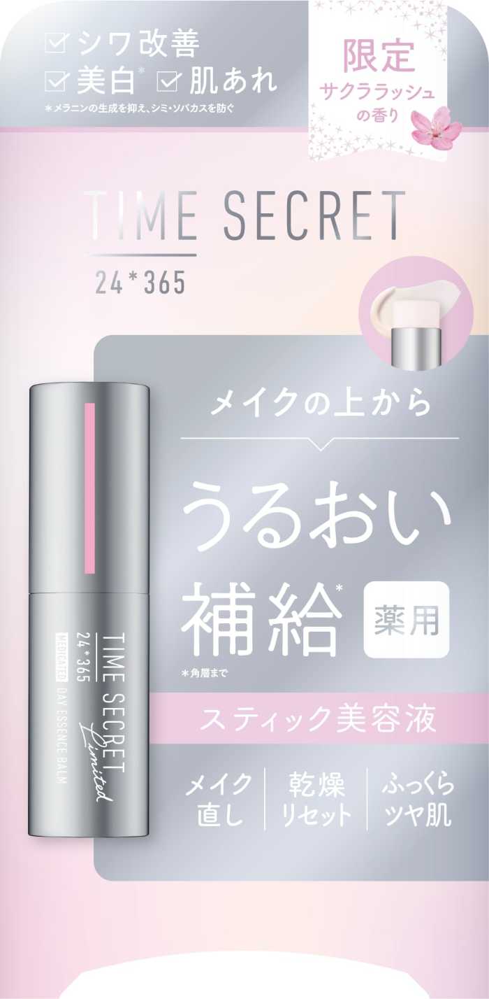 「タイムシークレット 薬用デイエッセンスバーム サクララッシュの香り」(7g/1,980円)は、有効成分ナイアシンアミドを配合したスティック美容液。