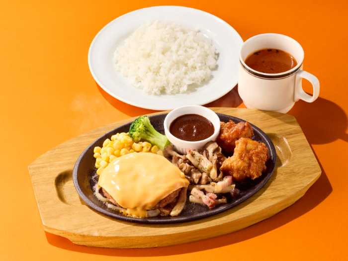 「チーズハンバーグトリオランチ」(990円税込1,089円)は、チーズハンバーグにきのことベーコンのソテー、唐揚げを添えた鉄板メニュー。