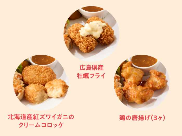 追加カレーソース(300円税込330円)や、フライトッピング(北海道産紅ズワイガニのクリームコロッケ・広島県産牡蠣フライ・鶏の唐揚げ 各330円税込)でさらに満足度アップ♡