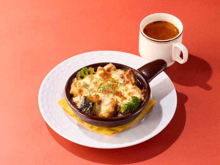 「ごろごろチキンのチーズカレードリアランチ」(990円税込1,089円)は、チキンやカボチャ、ブロッコリーを合わせたあつあつドリア。