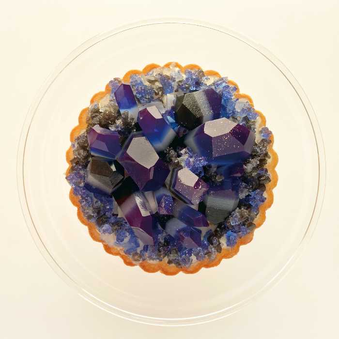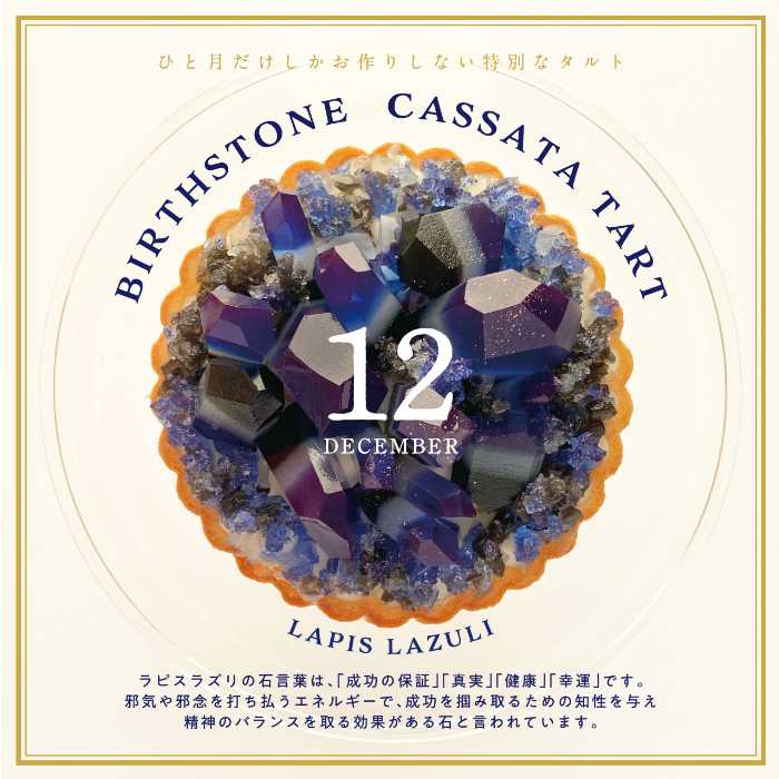 「誕生石のタルト〜12月ラピスラズリ〜」は、冬の夜空を思わせる濃い群青のこうぶつヲカシをランダムに配置し、金箔を散らすことで宝石のような輝きを再現したアイスケーキタルト。