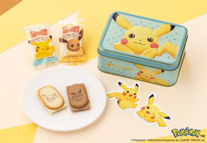 「ポケモン東京ばな奈 はみ出しチョコのクッキーサンド」は、バナナヨーグルト味(ピカチュウ柄)とキャラメルマキアート味(イーブイ柄)の2種が入った24枚入2,592円のセット。