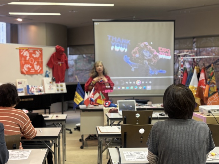 この日の講師の先生は、観光ジャーナリストのエリザベス村上先生、万博百日行と自ら謳い、105日間足を運び古希を迎えられたそうです。スライドショーにて、写真と動画で開幕から閉幕までを振り返りました。