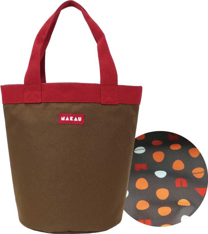 落ち着いた風合いに赤いワッペンが映え、内側にはこだわり卵をモチーフにした総柄デザインがあしらわれています。