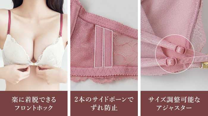 フロントホックブラの中でも珍しいアンダー調節機能を採用し、長時間でもストレスなく着用できるのが魅力。