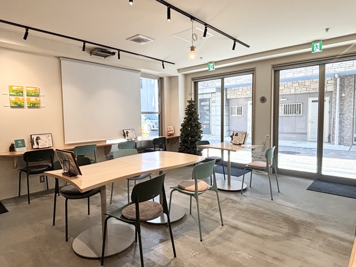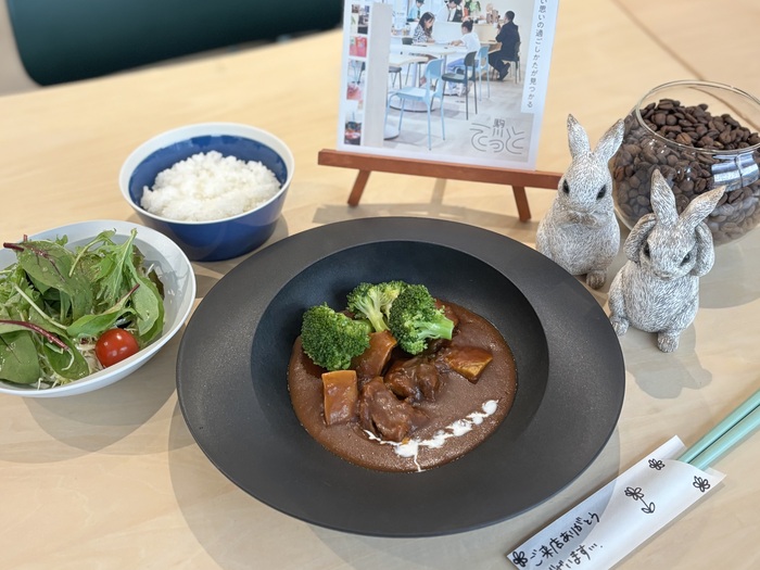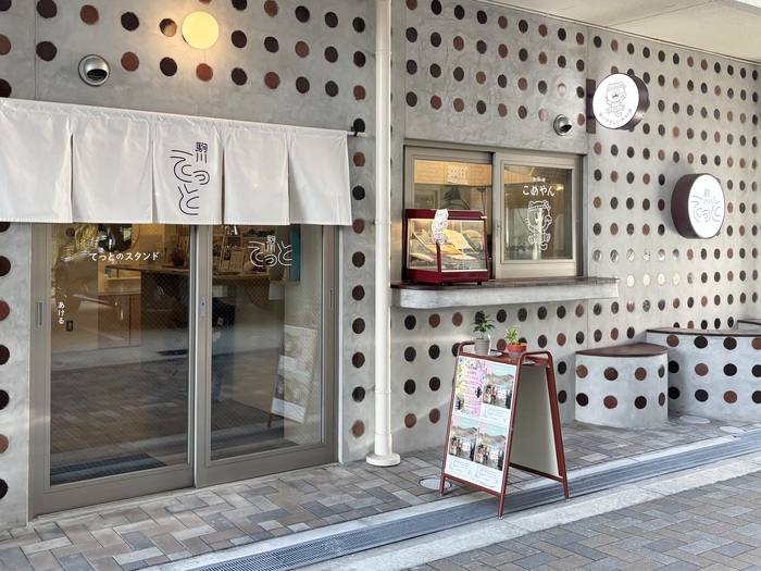 大阪メトロ谷町線「駒川中野」駅近くのお店、白い暖簾に描かれている「こめやん」というねこのキャラクターが目印で、ポップなドット柄のおしゃれなカフェ「駒川てっと」。こちらの施設は、子ども食堂・障がい者就労支援のサポートのカフェとして営業しており、子どもや近隣の地域にお住まいの方々、障がいを持つ方たちが気軽に立ち寄り、それぞれの楽しみ方で「仕事や役割としてのケア」ではなく、「偶然から生まれるケア」が生まれる居場所として運営されているカフェです。