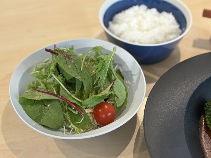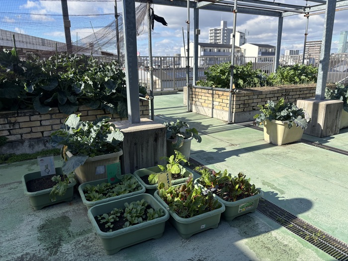 セットについてくるフレッシュなサラダに使用されているお野菜の一部は、なんと施設の屋上菜園にて育てた、無農薬野菜を使用しております。