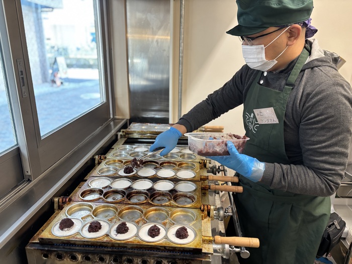 てっと名物「米粉焼こめやん」は、厳選された国産米粉を100%使用し、小麦粉は一切使用せず、体にやさしいグルテンフリーの回転焼きです。