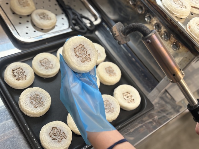 生地を流して専用の機械で焼かれた、焼きたての真っ白な回転焼きには、ねこのキャラクターこめやんの焼印。中にはたっぷりの明治創業三宅のあんが入っています。
