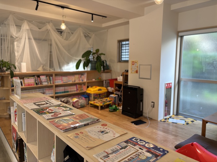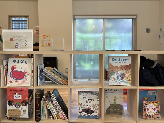 専用の本棚には、無料で気軽に借りて好きな場所に返す、おさんぽ絵本も設置されています。遊んだり、宿題をしたり、過ごしやすいスタイルでお過ごしいただけます。