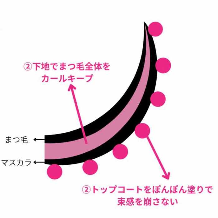 次に、お手持ちのマスカラを塗布して、束感やセパレート感を整えます。最後に、トップコートとして、まつ毛の根本から毛先にかけて押し当てるだけ。
