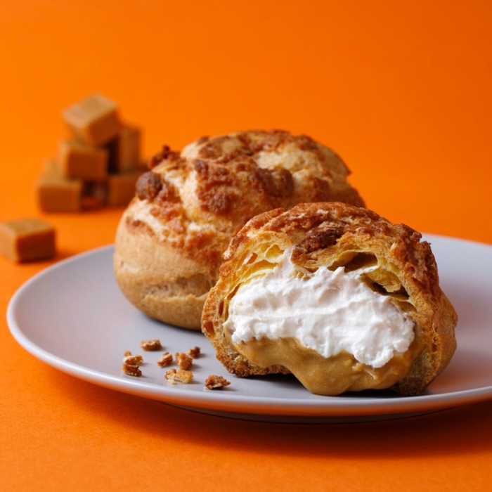 『贅沢なキャラメルとホイップのクッキーシュークリーム1個324円(税込)』は、香ばしく焼き上げたクッキー生地に濃厚キャラメルクリームと軽やかなホイップを重ねた2層仕立て。