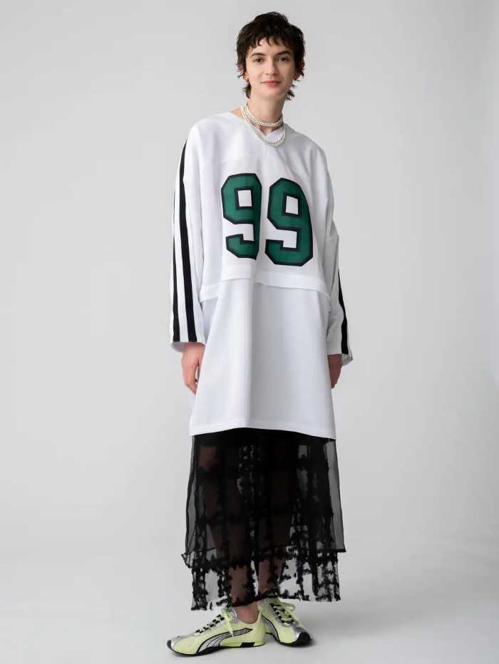 90年代デッドストックのフットボールジャージーをリメイクした、オーバーサイズのトップスは、袖と裾のジップデザインがポイント。