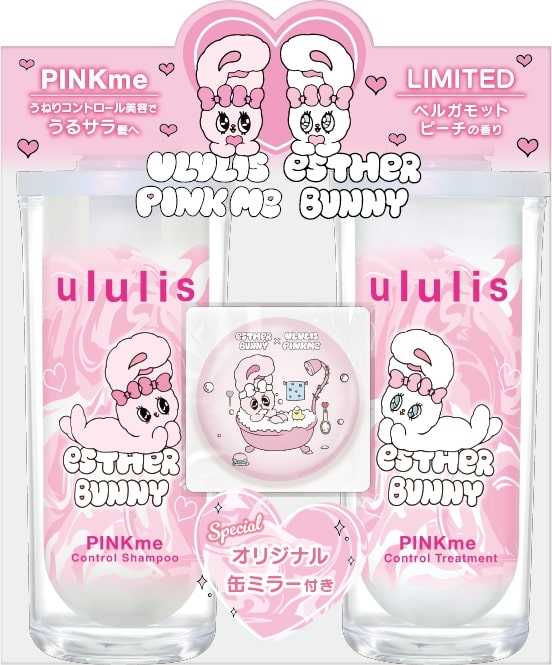 「ウルリス エスターバニー ピンクミー コントロール ペアセット」(3,080円・税込)は、シャンプー(340mL)、ヘアトリートメント(335g)、缶ミラーがセットに。